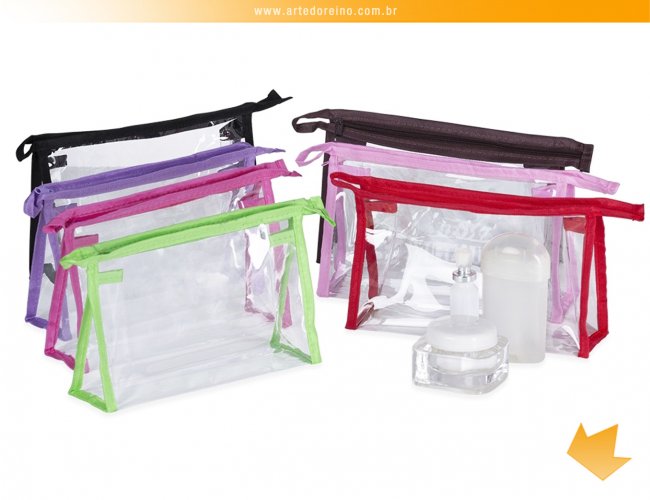 Necessaire plástica transparente com detalhe colorido em nylon.