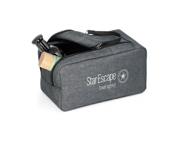 Bolsa de cosméticos em 600D de alta densidade com pega e interior forrado.