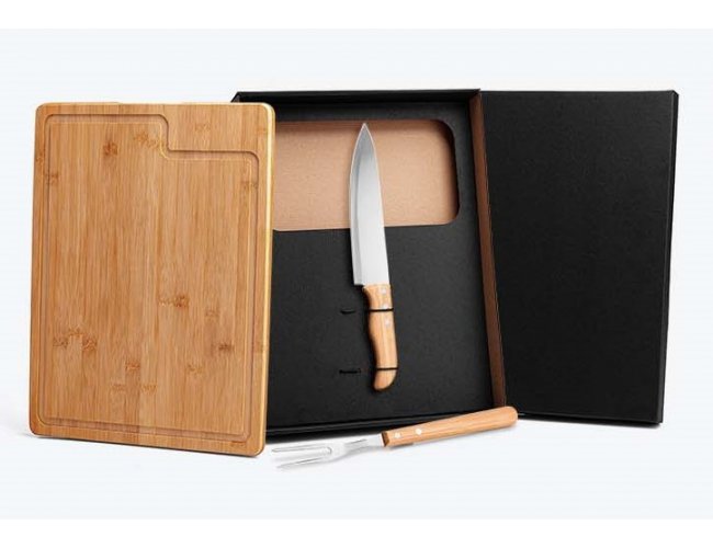 Kit para Churrasco/Cerveja/Truco; Acompanha tábua com três furos em Bambu; Faca 8'' e garfo em Bambu/Inox; Quatro copos de Cerveja em vidro; Bloco de anotação; Caneta esferográfica; Jogo de cartas. Tábua confeccionada com tripla camada invertida, para dar maior durabilidade e não deformar com o passar do tempo.