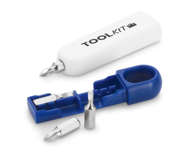 Conjunto de mini chave de parafusos em PS com 4 pontas diferentes removíveis com opção de guardar as peças no corpo. 92 x 22 x 13 mm.
