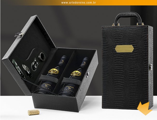 Kit vinho 4 Peças em maleta de couro sintético com duas repartições para garrafas. Contém saca-rolhas metálico, bico con