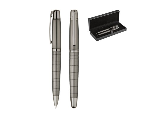 Conjunto de roller e esferográfica com mecanismo twist, ambos em metal e com clipe. Esferográfica até 2km de escrita. Fornecida em estojo almofadado. ø12 x 132 mm | Estojo: 170 x 70 x 30 mm